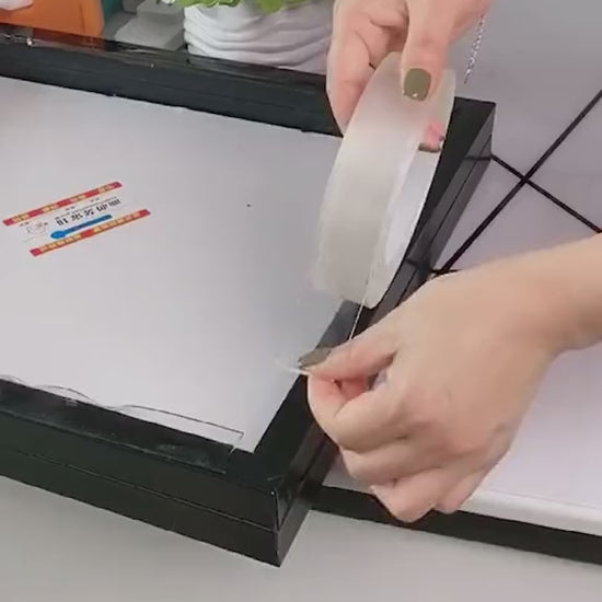 Our Double Sided Nano Tape is the all-round fixing hero for your home, office, and DIY projects. The crystal-clear tape holds up to 5 kg per metre, sticks on most smooth surfaces, and can be washed and reused again and again.